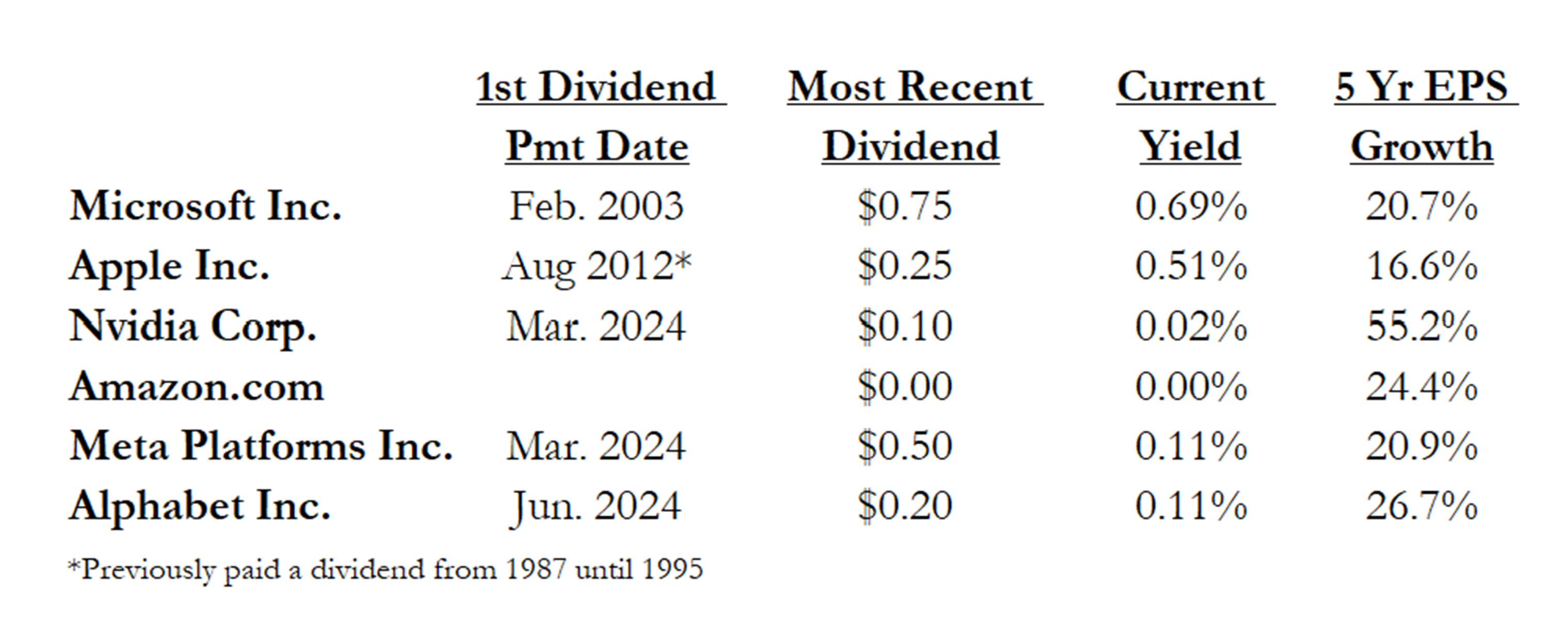 Below is a table of the top 6 holdings in the S&P 500 (which are all a part of the tech+ category), when they started paying a dividend, and the amount.